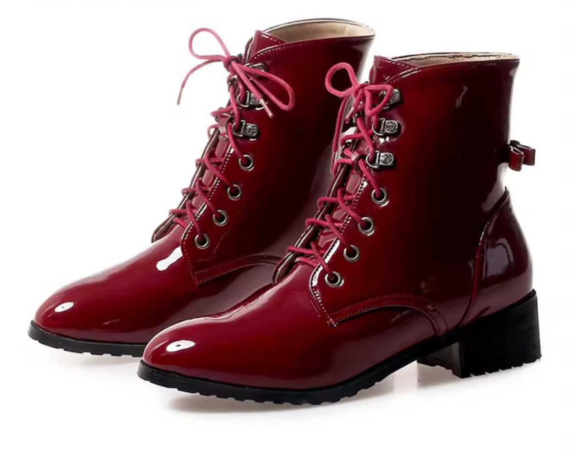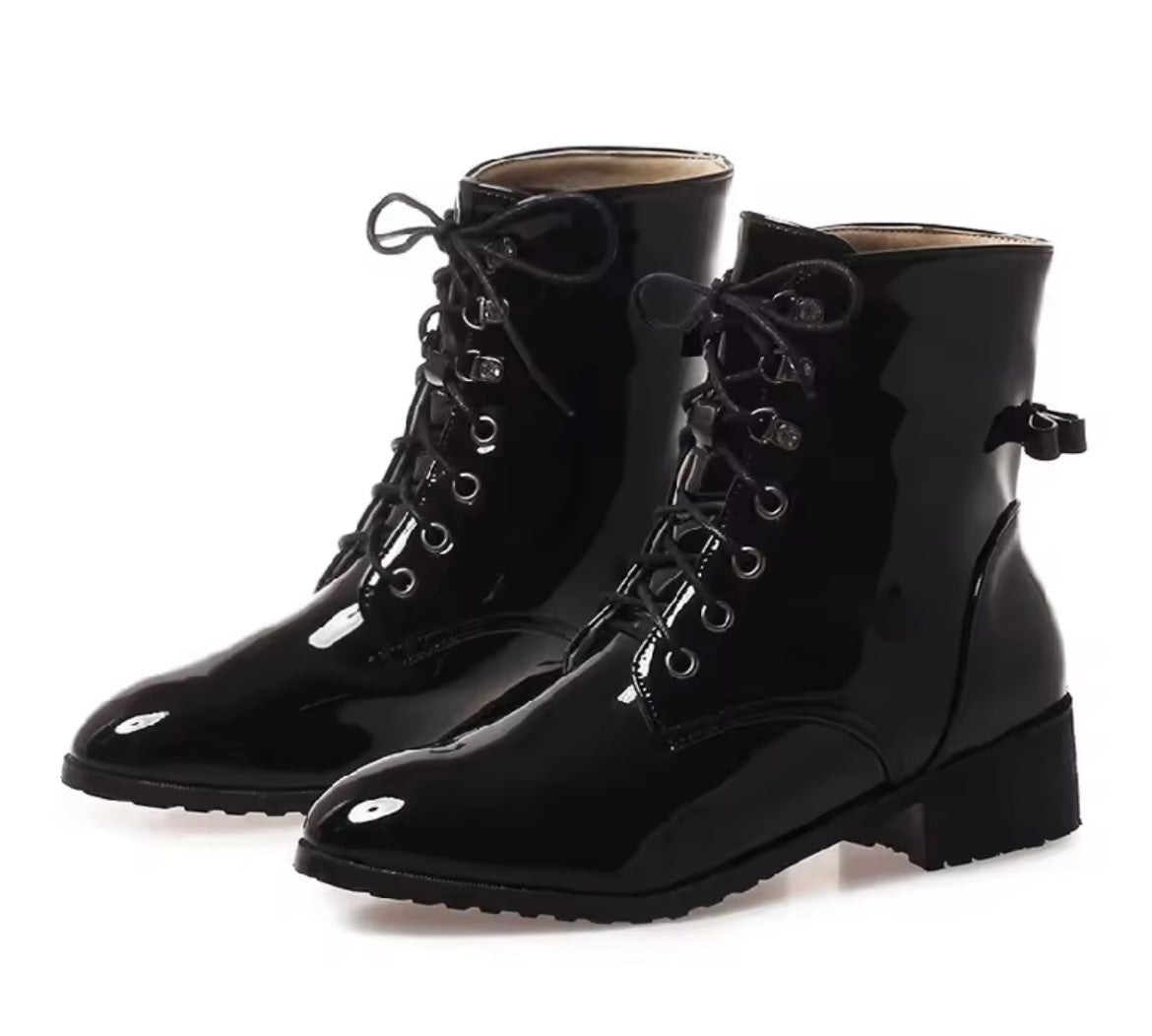 These glossy black lace-up ankle boots strike the perfect balance between polished edge and playful detail. High-shine patent leather that catches light with every step, lending a futuristic flair while the low block heel offers sturdy elevation without the strain of a higher lift.