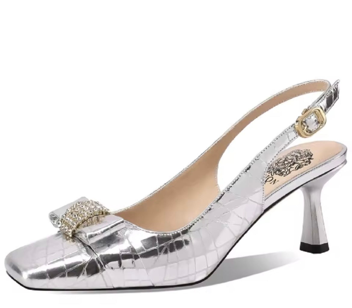 Genuine leather, these heels are pure opulence with a vintage twist. Drenched in metallic, they shimmer with a quilted texture that adds depth and richness to the surface. The pointed toe is adorned with a delicate bow, encrusted with rhinestones that sparkle like jewellery—making the front of the shoe feel like a gift waiting to be unwrapped.