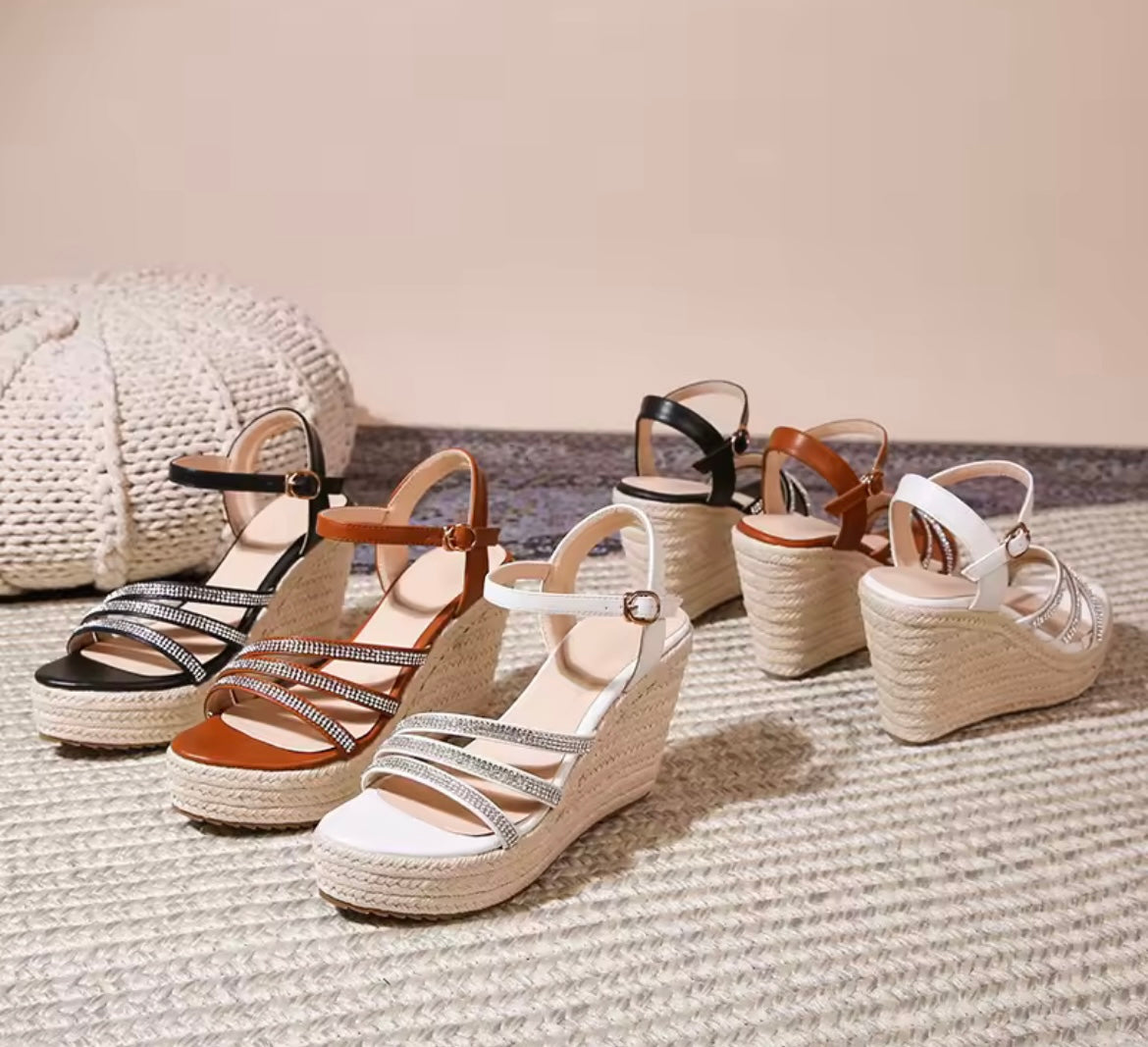 The Roz wedges are absolutely stunning summer statement pieces! These sandals strike that coveted balance between laid-back charm and shimmering elegance. Each sandal is wrapped in delicate multi-straps that sparkle with tiny rhinestones, catching the light in a way that whispers sophistication without screaming for attention. The ankle buckle isn’t just practical—it adds a refined, tailored touch that elevates the whole silhouette and the woven-textured wedge heel evokes a breezy, coastal vibe, blending naturally with linen jumpsuits, floaty maxi dresses, or even chic cropped trousers. These wedges feel like summer sunsets on a rooftop paired with chilled rosé.